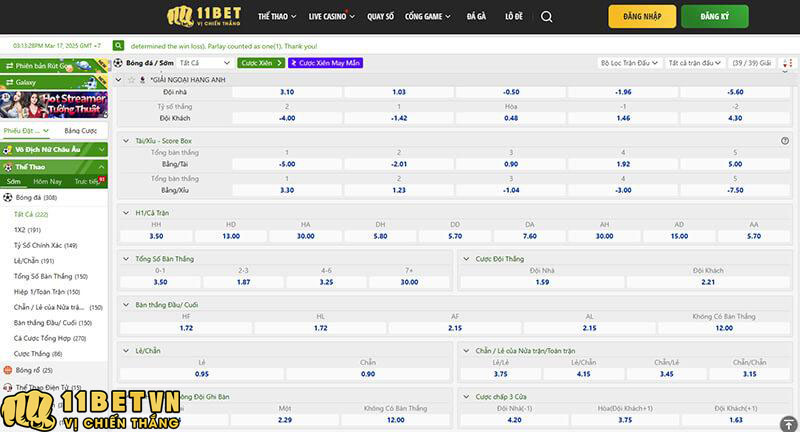 Riêng về mảng cá cược bóng đá online, phía 11BET đã làm rất tốt trong phần tối ưu thông tin về kèo cược. Thậm chí, sân chơi này còn đưa ra khá nhiều loại kèo cược bóng đá khác nhau. Mỗi trận đấu khi diễn ra đều có hàng chục loại kèo cược bóng đá để người chơi lựa chọn.